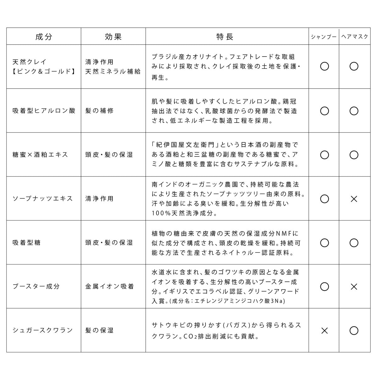 この天然クレイを配合することで、頭皮の汚れを吸着除去し、毛穴をすっきりと洗いあげ、健康な頭皮と、軽やかな指通りの良い髪に整えます。