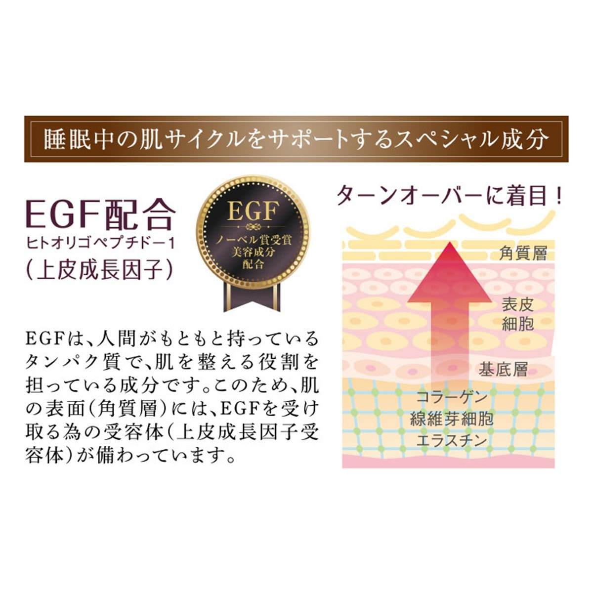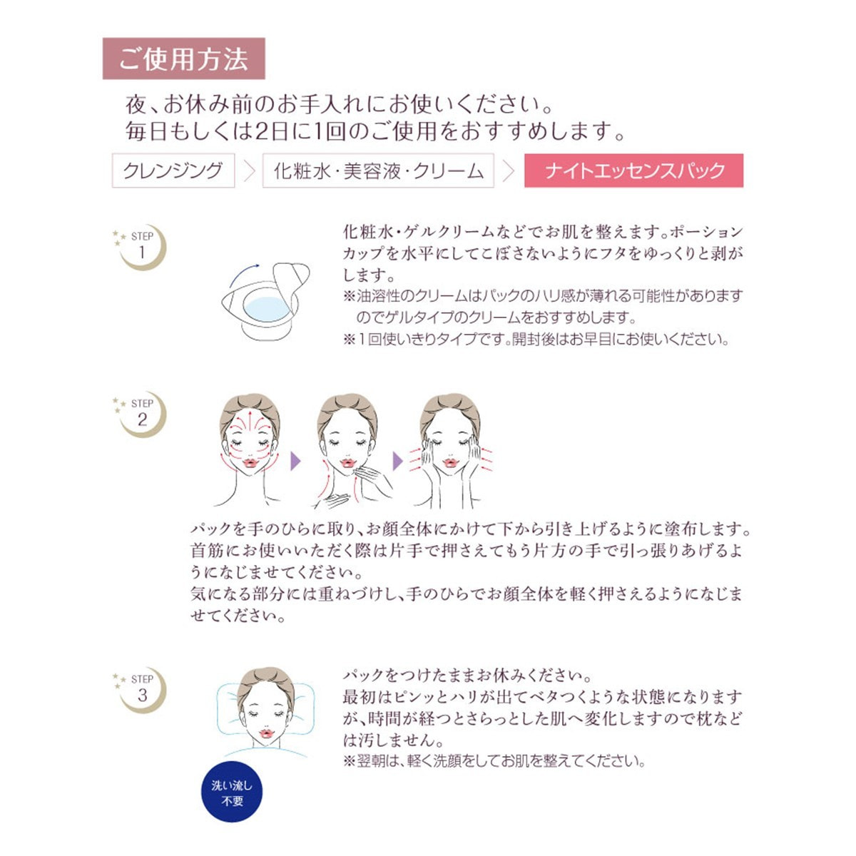 睡眠中のターンオーバーに着目したナイトエッセンスパックは、                  お休み前に塗るだけの簡単液状パックです。                            EGF(上皮成長因子)と厳選した美容成分がお肌をイキイキとさせ、                健やかに保ちます。